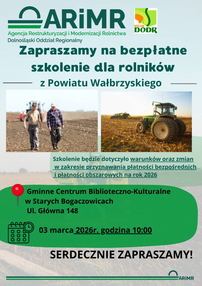 Dolnośląski Oddział Regionalny ARiMR we współpracy z zespołem doradców powiatowych @DODR zaprasza na spotkanie dla rolników Gminy Stare Bogaczowice.