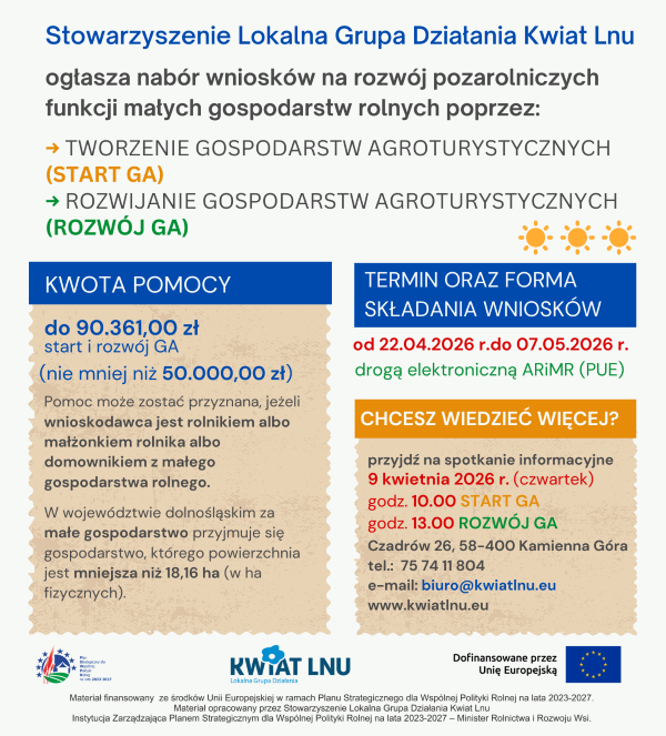Stowarzyszenie Lokalna Grupa Działania Kwiat Lnu ogłasza nabór wniosków na rozwój pozarolniczych funkcji małych gospodarstw rolnych poprzez: