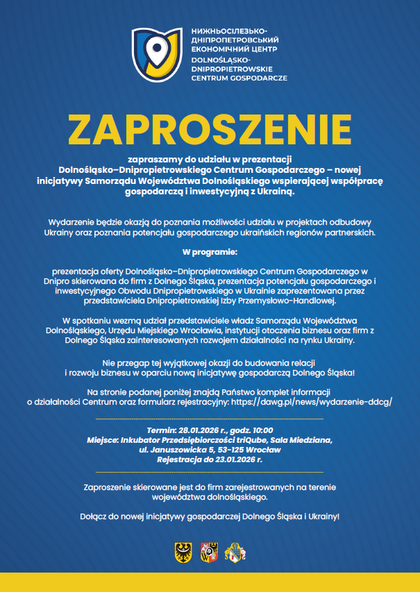 wydarzenia pn. Prezentacja Dolnośląsko–Dnipropietrowskiego Centrum Gospodarczego, które odbędzie się 28 stycznia 2026 r. we Wrocławiu.