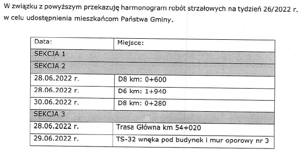 Harmonogram robót strzałowych w dniach 28, 29 i 30 czerwca 2022 roku