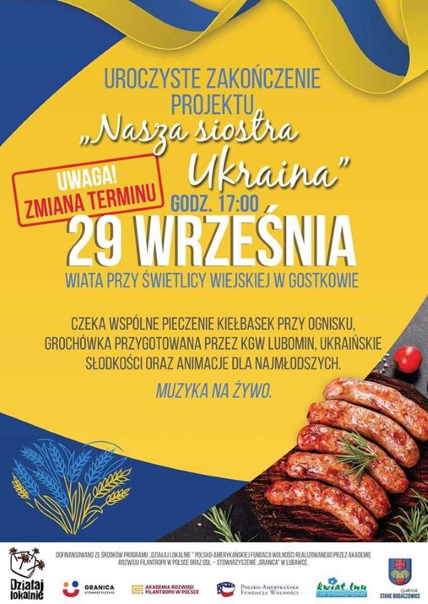 29 września 2022 r. o godzinie 17:00 pod wiatą przy Świetlicy wiejskiej w Gostkowie zapraszamy na uroczyste zakończenie projektu "Nasza siostra Ukraina". Na gości czeka wspólne pieczenie kiełbasek przy ognisku, grochówka przygotowana przez Koło Gospodyń Wiejskich z Lubomina, ukraińskie słodkości oraz animacje dla najmłodszych i muzyka na żywo.