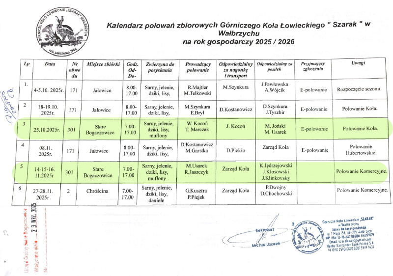 Kalendarz polowań zbiorowych Górniczego Koła Łowieckiego Szarak w Wałbrzychu na rok gospodarczy 2025-2026