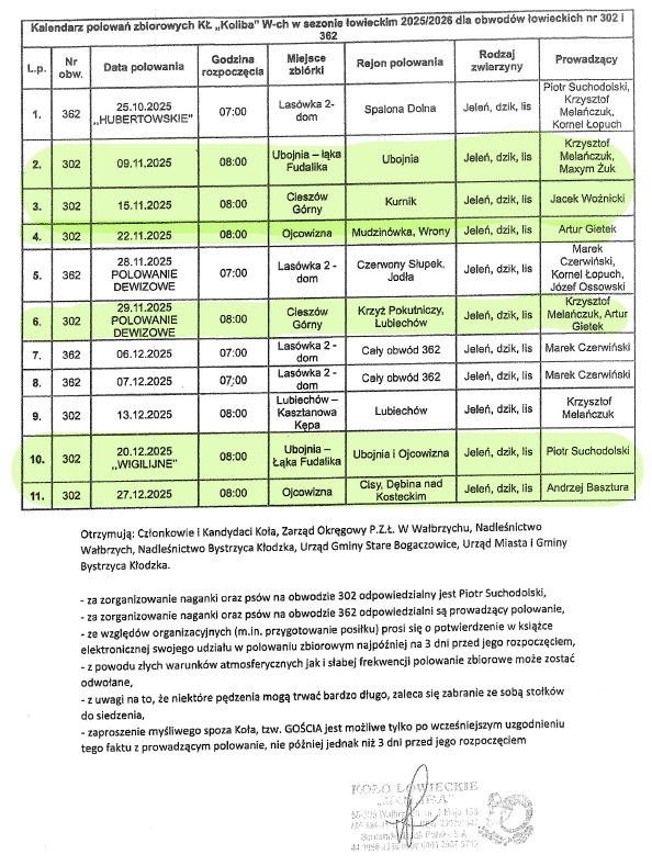 Kalendarz polowań zbiorowych Koła Łowieckiego Koliba Wałbrzych w sezonie łowieckim 2025-2026