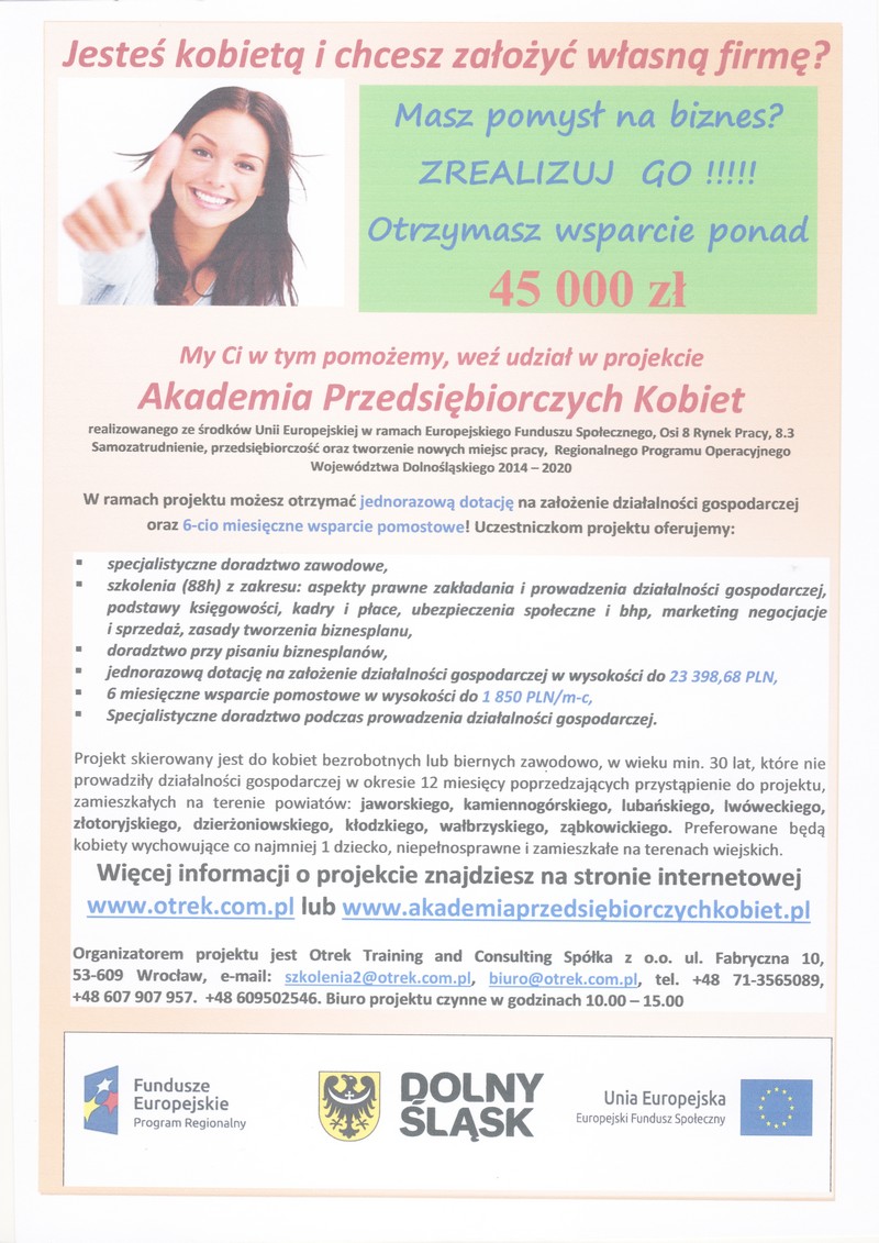 Firma OTREK Training and Consulting Sp. z o.o. z Wrocławia na zamówienie Dolnośląskiego Wojewódzkiego Urzędu Pracy realizuje projekt pn. „AKADEMIA PRZEDSIĘBIORCZYCH KOBIET” skierowany do kobiet bezrobotnych i biernych zawodowo (w tym także kobiet przebywających na emeryturze). Projekt jest finansowany z Regionalnego Programu Operacyjnego i polega na przeszkoleniu i przygotowaniu do prowadzenia własnej działalności oraz wsparcie finansowe. Uczestniczki projektu, które zdecydują się podjąć działalność gospodarczą i utrzymać ją przez 12 miesięcy otrzymają jednorazową dotację w wysokości 23 398,68 PLN oraz wsparcie pomostowe przez 6 miesięcy w wysokości 1850 PLN/m-c. Poza wsparciem finansowym oferujemy także wsparcie szkoleniowo-doradcze w wymiarze 88 godzin w celu przygotowania uczestniczek do uruchomienia i prowadzenia własnej działalności gospodarczej. Projektem tym objęty jest m.in. Powiat Wałbrzyski (ziemski), stąd szukamy wsparcia w różnych instytucjach samorządowych, urzędach pracy oraz w instytucjach pozarządowych.