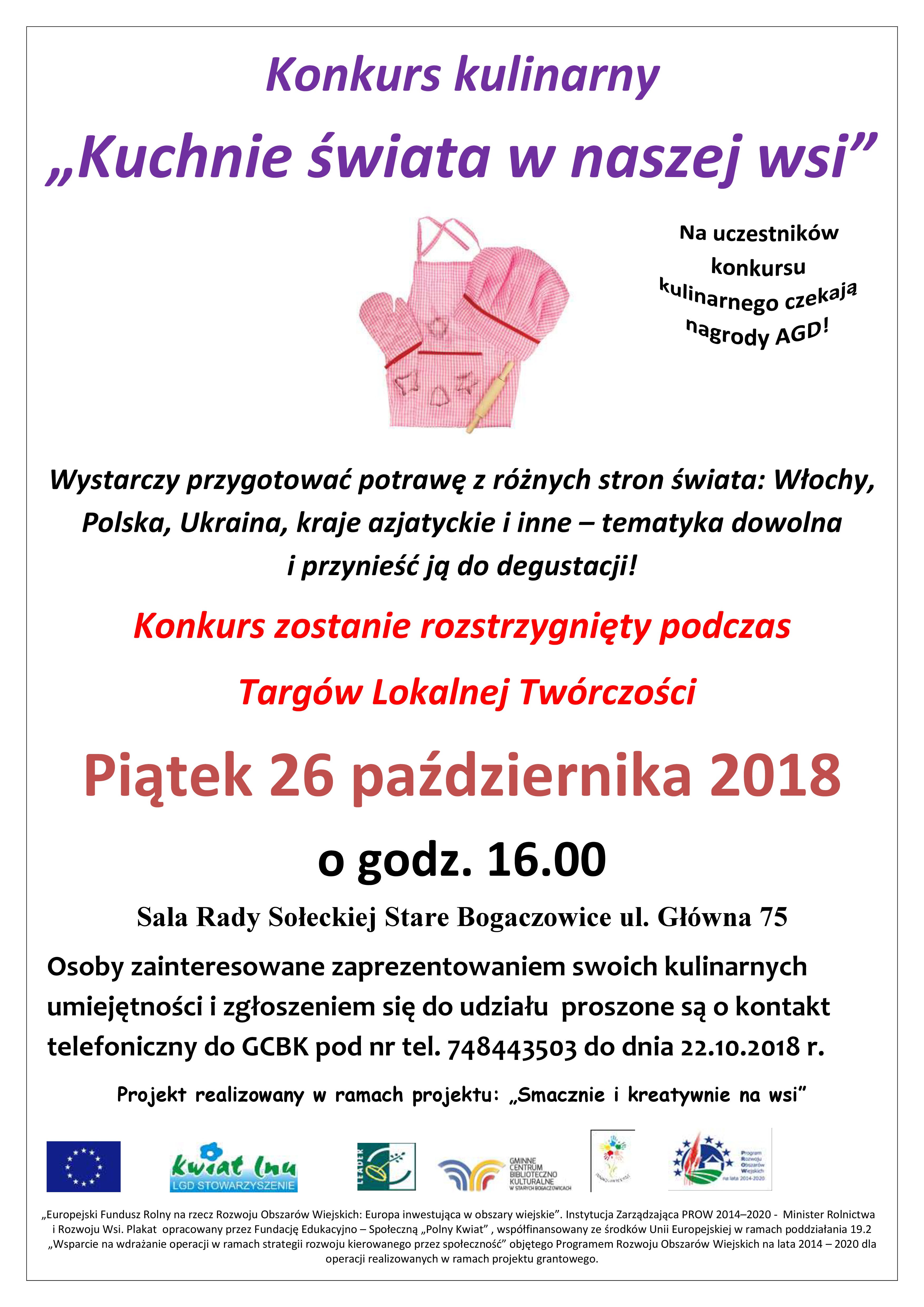 - konkurs kulinarny „Kuchnie świata w naszej wsi” - do konkursu należy się zgłosić do dn. 22.10.2018 , na uczestników czekają atrakcyjne nagrody AGD, w domu należy